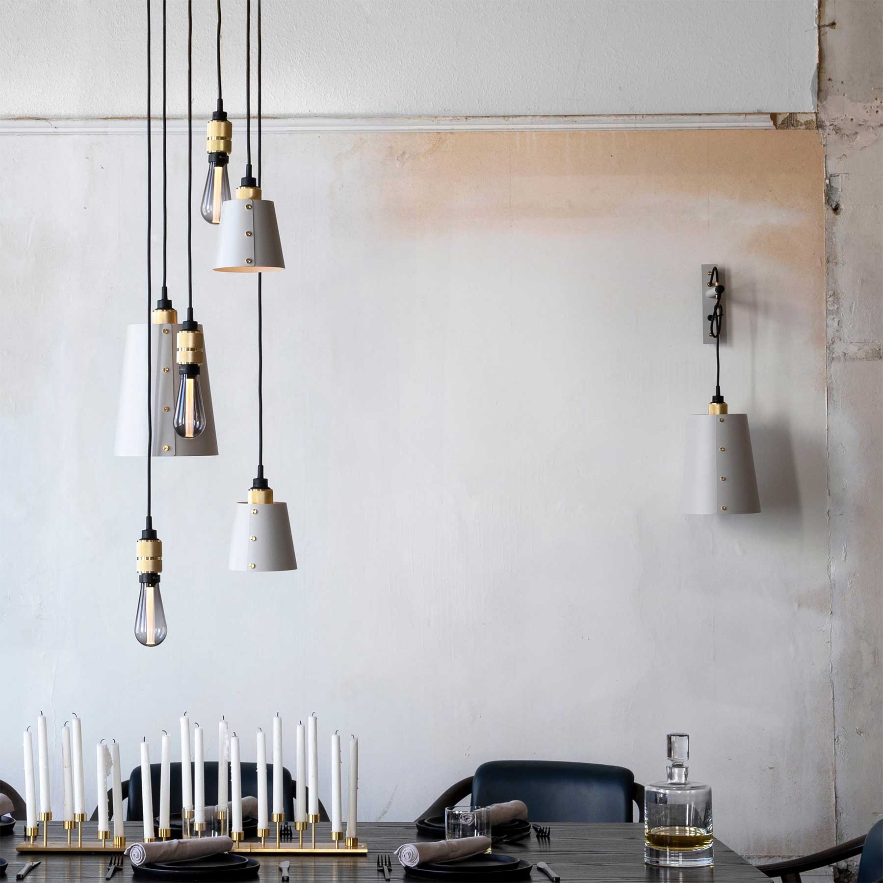 The HOOKED Mixchandelier from the London-based brand Buster & Punch is the perfect combination of modern design and individual customisation. This chandelier is available with three or six pendant lights, each with its own adjustable hook and complete with matt rubber details. Also included is a combination shade with a stone powder coated finish, giving the chandelier an industrial yet sophisticated look. Each pendant is freely adjustable and can be hung from a sturdy metal hook attached to the base or directly into the ceiling, allowing you to create a unique sculptural shape and spread the pendants over furniture or other elements in the interior. Both bare bulbs for exposed pendants and bulbs with shades for covered pendants are available, and we recommend using a dimmer for the perfect ambiance. Bulbs are not included. The height of the pendants can be adjusted either by inserting the excess cable into the space in the base, or by shortening it (this intervention must be carried out by a qualified electrician). The chandelier is available with pendants in STEEL, BRASS or SMOKE BRONZE finishes, making it the ideal choice for modern interiors where you are looking for the perfect harmony of functionality, elegance and individuality.
