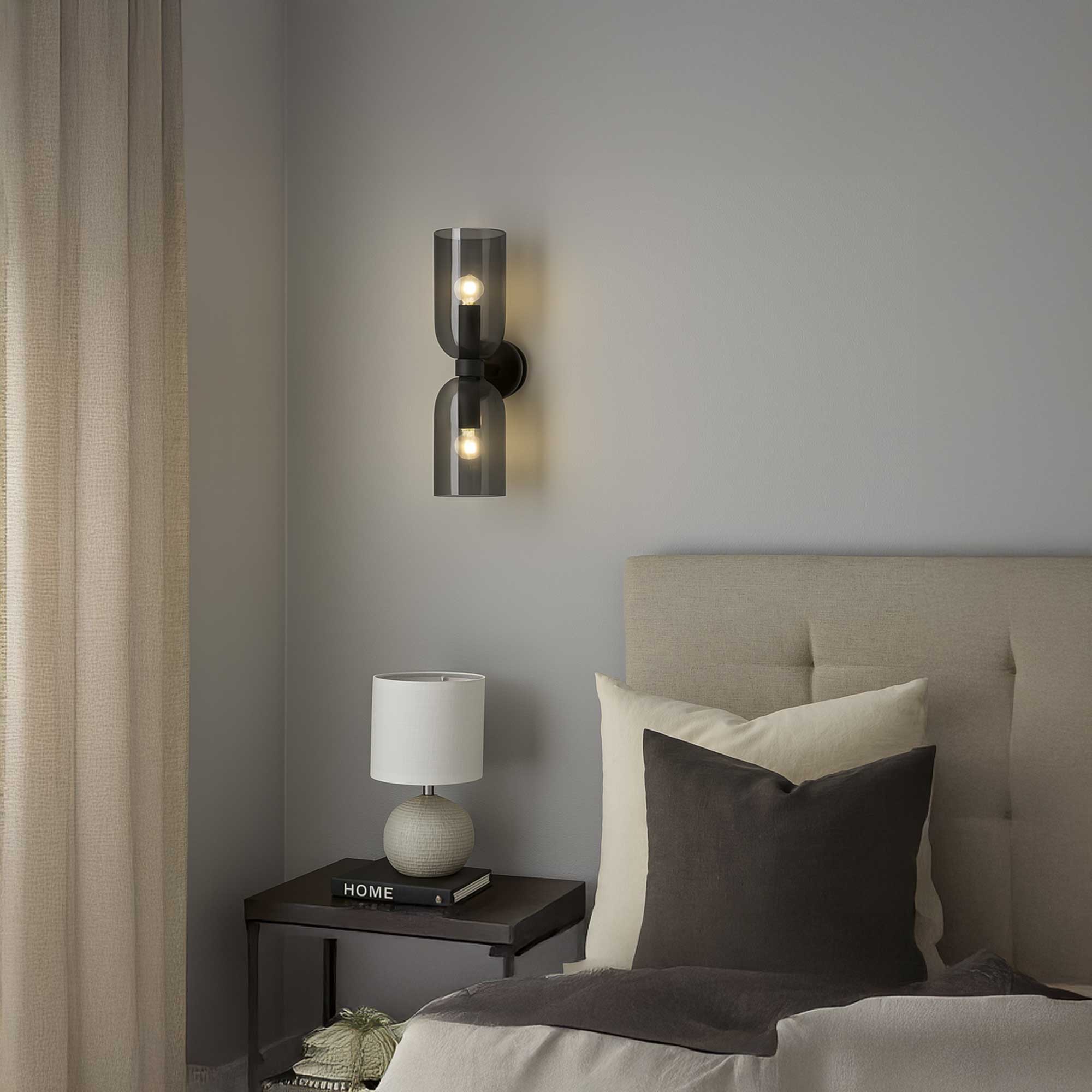 Die Palmer des griechischen Herstellers Nova Luce besticht durch ihren modernen und eleganten Look, bestehend aus einem Paar gegenüberliegender Rauchglasschirme, die durch schwarze Metalldetails ergänzt werden. Die Leuchte ist mit einem 2× E27 Sockel ausgestattet, so dass Sie die Intensität und den Charakter des Lichts je nach den verwendeten Glühbirnen wählen können. Sie eignet sich perfekt für das Schlafzimmer, das Wohnzimmer, den Flur oder stilvolle Geschäftsräume, wo sie als dekoratives und praktisches Beleuchtungselement dienen kann.