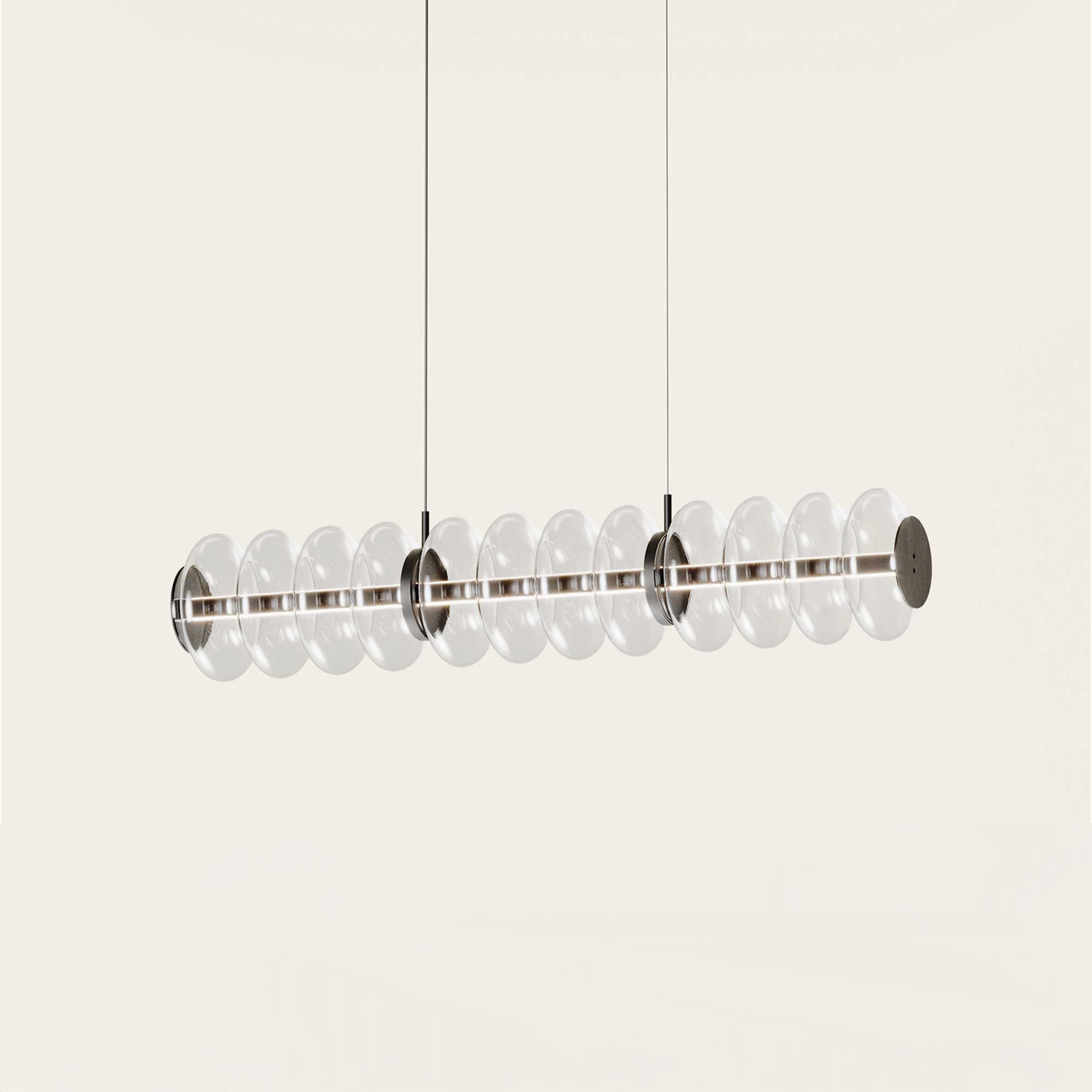 Die Vitree L von Aromas del Campo ist eine beeindruckende Version des klassischen Vitree-Modells, die durch die Verbindung von drei Vitree-Schirmen in einer Längsanordnung entsteht . Jeder Schirm besteht aus klarem, gewelltem Glas mit Metalldetails in mattem Schwarz oder patiniertem Gold. Zusammen bilden sie ein spektakuläres Designelement, das sich für größere Räume eignet. Im Inneren ist ein dimmbarer TRIAC-gesteuerter LED mit 28 W, 2700 K, 2000 lm integriert, der ein angenehmes warmes Licht und eine präzise Dimmfunktion bietet . Vitree L ist ideal über einem Esstisch, in einem Wohnzimmer oder in modernen gewerblichen Räumen, in denen Sie Design, Lichtfunktionalität und anspruchsvolle Eleganz miteinander verbinden möchten.