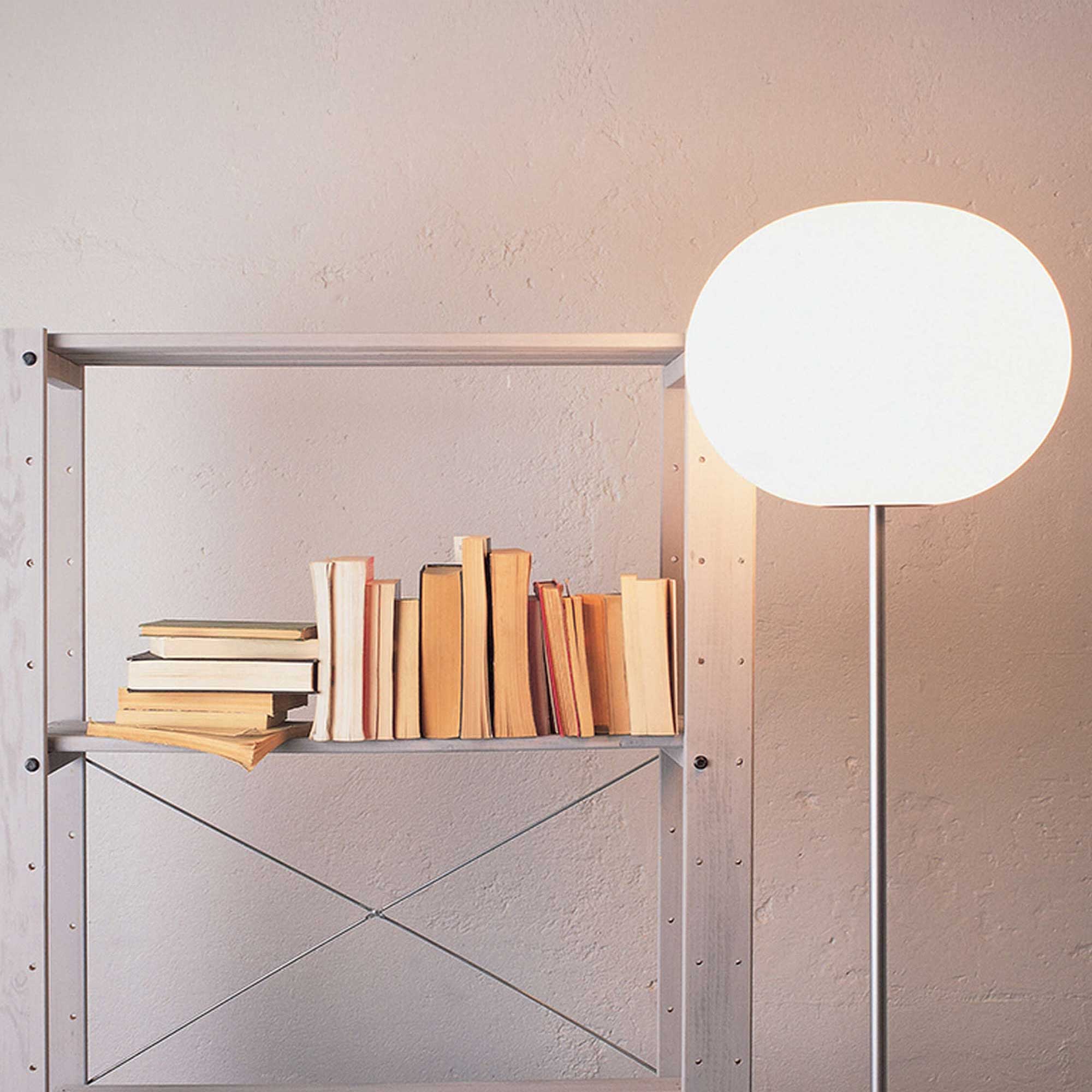Die 1998 von Jasper Morrison entworfene Glo-Ball der italienischen Marke Flos verkörpert eine minimalistische Ästhetik mit Schwerpunkt auf atmosphärischem Licht. Der schlanke, kugelförmige Diffusor, der an einen Vollmond erinnert, besteht aus mundgeblasenem Opalglas mit einer säuregeätzten Oberfläche, die ein weiches und gleichmäßig gestreutes Licht erzeugt. Sockel und Fuß der Leuchte sind aus schwerem Stahl mit grauer oder schwarzer Lackierung gefertigt. Das Design wird durch eine Diffusorhalterung aus Aluminiumdruckguss vervollständigt. Am Netzkabel befindet sich ein elektronischer Dimmer, mit dem die Lichtintensität je nach Stimmung oder Bedarf des Raumesstufenlos eingestellt werden kann.