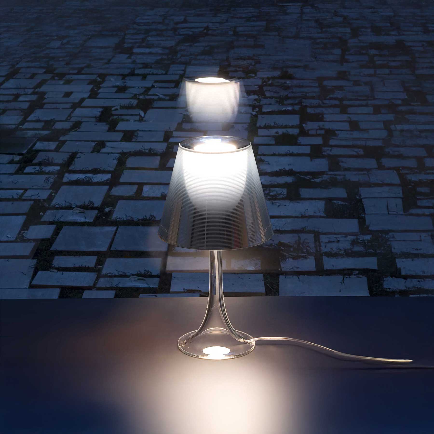 Tischlampe Fräulein K. von der italienischen Marke Flos, vorgeschlagen Philippe Starck, ist ein ikonisches Beispiel modernes Design kombinieren. technologische Präzision s ästhetische Raffinesse. Bereitgestellt von weiches, diffuses Licht Danke Interner Diffusor aus opalisiertem Polycarbonat a Äußerer Schirm aus transparentem oder farbigem Polycarbonatdie mit Technologie modifiziert wird Hochvakuum-Aluminierung - wenn sie erloschen ist, wirkt sie metallisch und verspiegeltnach eleganter Beleuchtung durchsehen. Der Lampenrahmen ist vollständig transparent und hergestellt aus PMMA durch Spritzgießen. Fräulein K. ist ideal für Schlafzimmer, Wohnräume und stilvolle Arbeitsräumewo er sich als funktionelles und dekoratives Element.