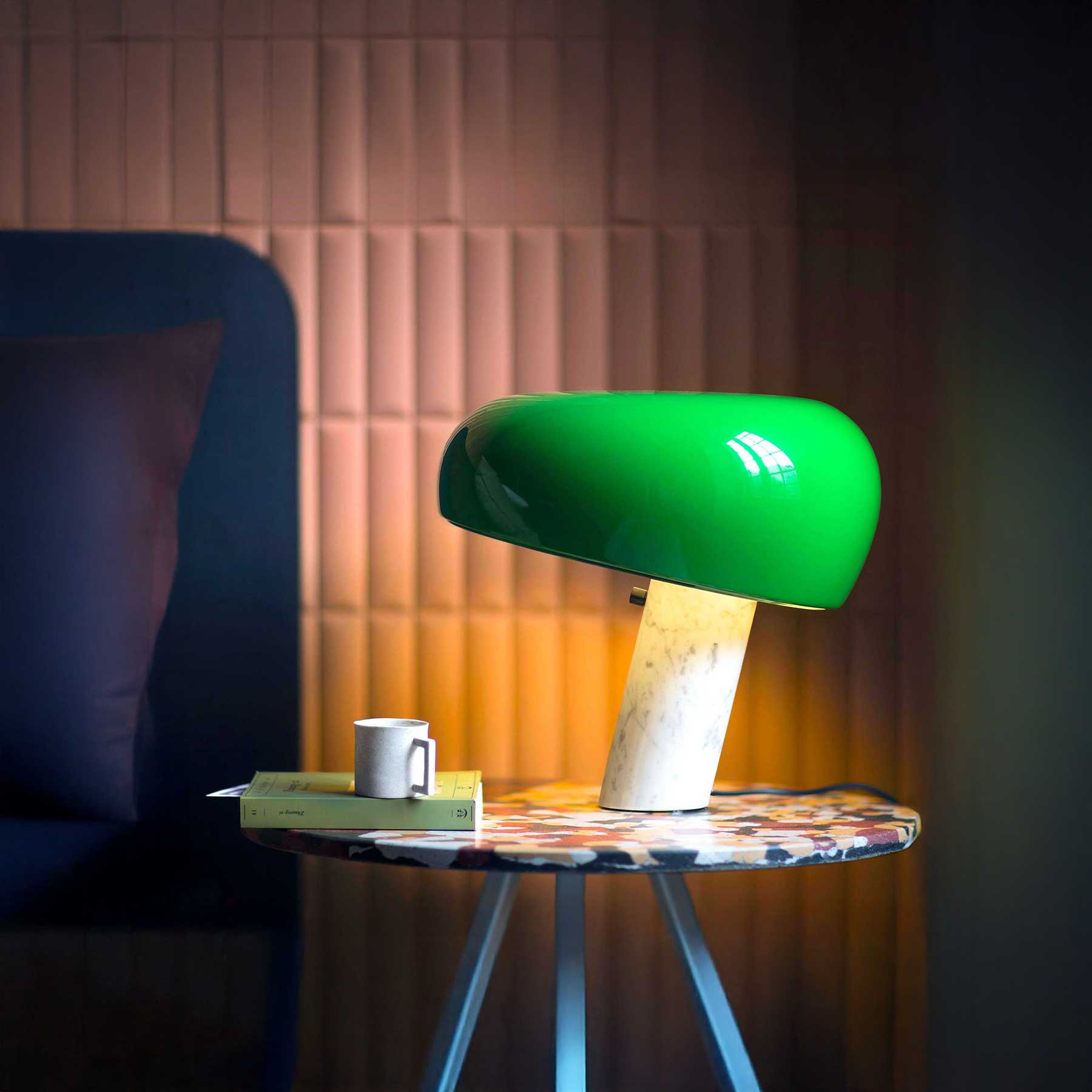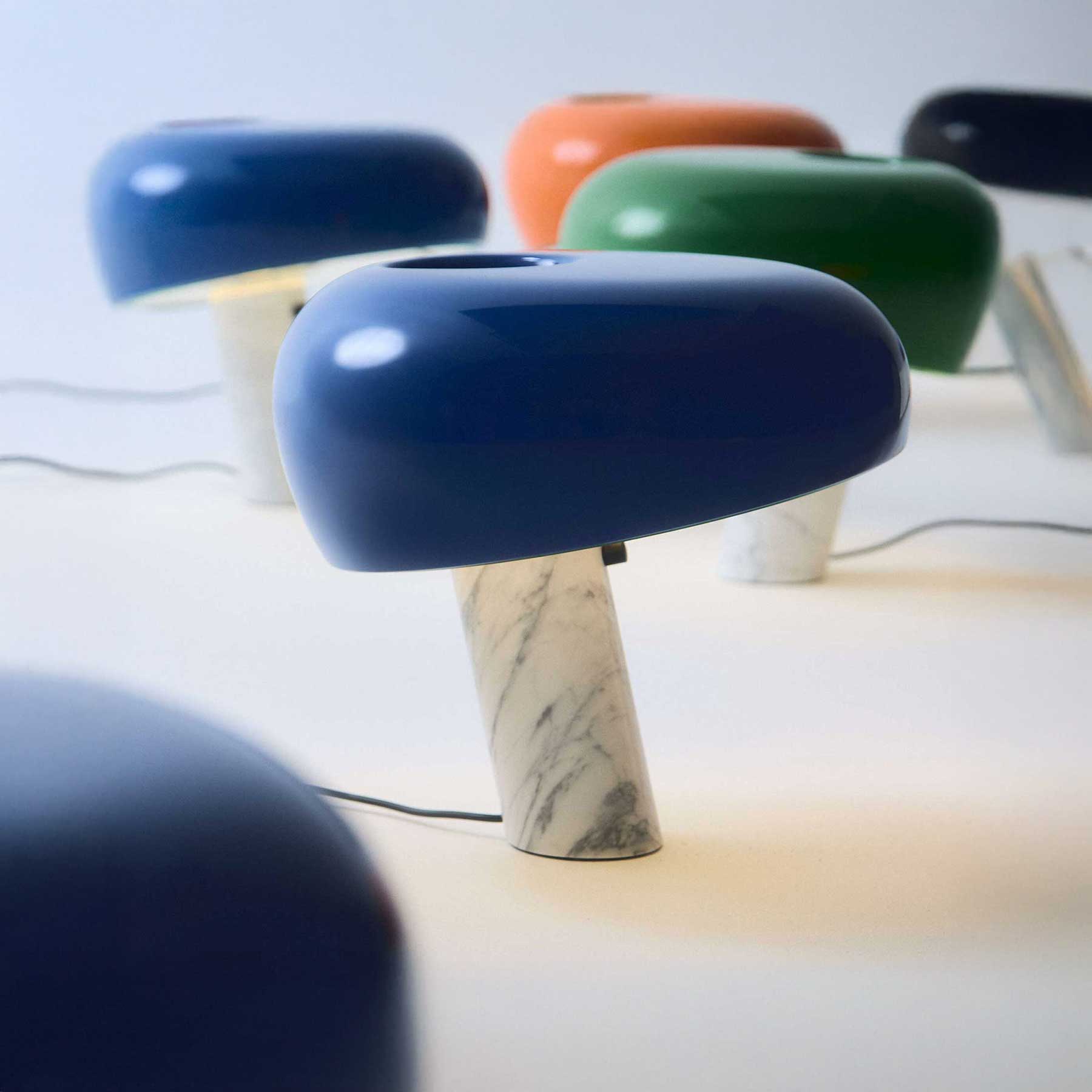 Snoopy vom italienischen Unternehmen Flos ist eine ikonische Tischleuchte mit direktem Licht, die 1967 von Achille und Pier Giacomo Castiglioni entworfen wurde. Sie verbindet Funktionalität mit subtilem Humor - ihre Form erinnert an den berühmten Cartoon-Hund Snoopy, von dem sie ihren Namen hat. Die Leuchte hat einen schrägen Sockel aus weißem Carrara-Marmor und einen emaillierten Metallreflektor, der eine elegante und zugleich verspielte Optik erzeugt. Dank der damals bahnbrechenden Einbindung von Technologie in den Marmorsockel und der perfekt ausbalancierten Konstruktion ist Snoopy zu einem zeitlosen Symbol für intelligentes italienisches Design geworden.