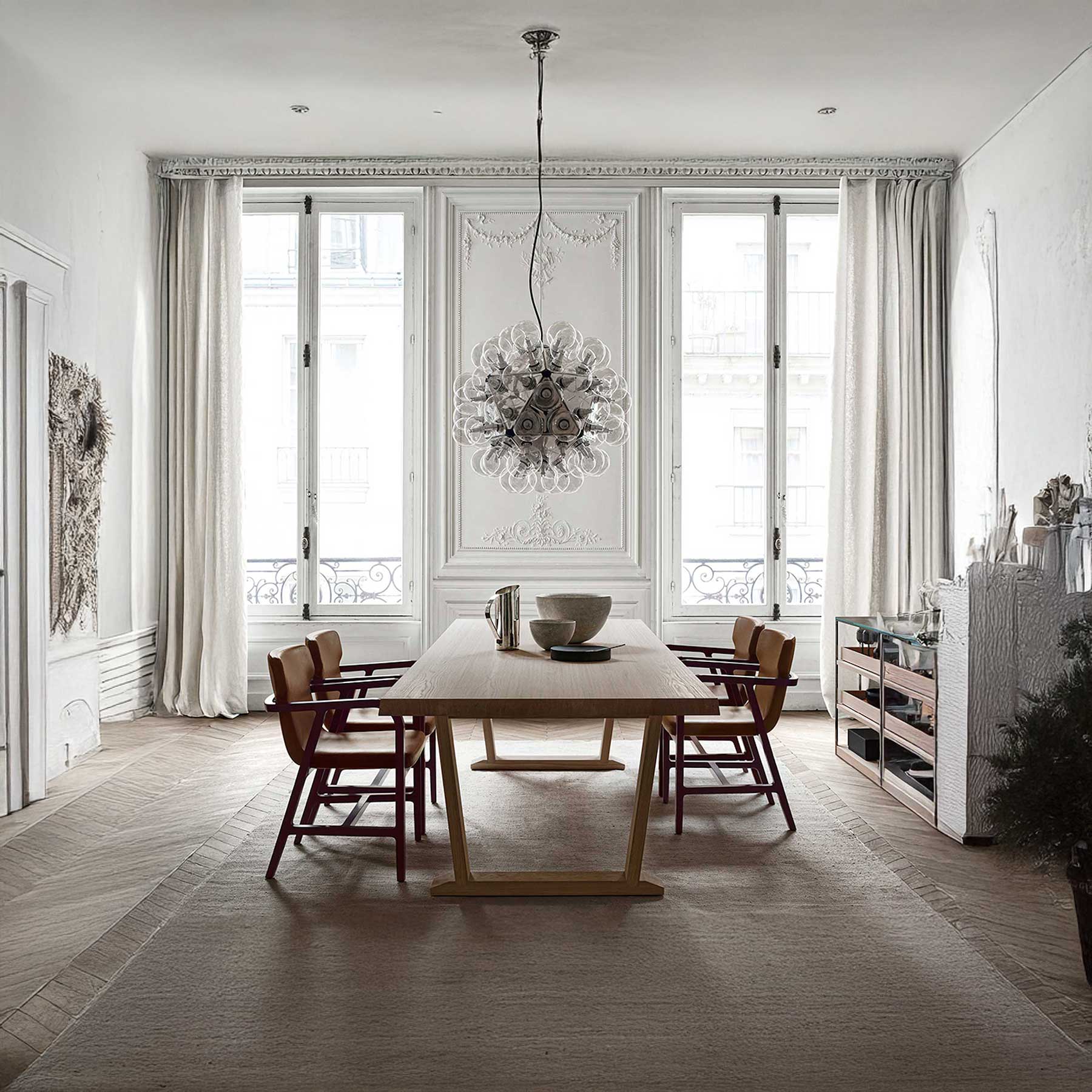Die Taraxacum 88 des italienischen Herstellers Flos ist eine ikonische , die 1988 von Achille Castiglioni entworfen wurde. Diese markante spendet sowohl direktes als auch reflektiertes Licht. Ihre Konstruktion besteht aus 20 polierten Dreiecken aus stranggepresstem Aluminium, die eine geometrische, fast skulpturale Komposition bilden. Um diese Metallstruktur herum befinden sich 60 klare Globolux-Lampen, die für eine intensive Beleuchtung sorgen und gleichzeitig den architektonischen Charakter der unterstreichen. Taraxacum 88 ist nicht nur eine Lichtquelle, sondern auch ein Designmanifest, das technische Präzision mit visueller Eleganz verbindet. Sie wird mit einer Deckenhalterung aus Stahl und einer Rosette geliefert, die eine sichere Aufhängung gewährleistet.