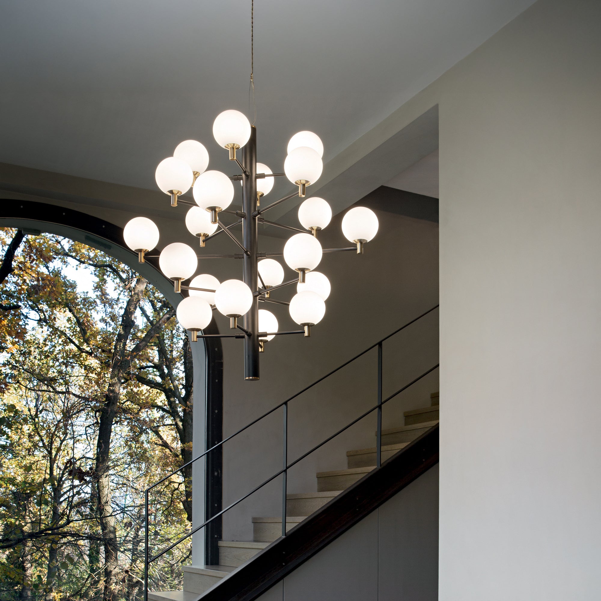 Copernico von dem italienischen Unternehmen Ideal Lux kombiniert moderne Eleganz s zeitloses Design. Die Leuchte hat mattschwarzes Metallgehäuse, auf dem die aus dünnen Barren mit goldenem Finish Fixiert Diffusoren aus mundgeblasenem Glas s weißer Mattlack und geätzte Oberfläche für eine subtile Lichtstreuung. Die Leuchte ist erhältlich mit 12 oder 20 Diffusorenund ermöglicht Ihnen die Anpassung von die Intensität und Reichweite der Beleuchtung nach Raum. Kombination Schwarze Metallkonstruktion mit goldenen Details a feines Opalglas ergänzt das Interieur luxuriöses und anspruchsvolles Aussehen.