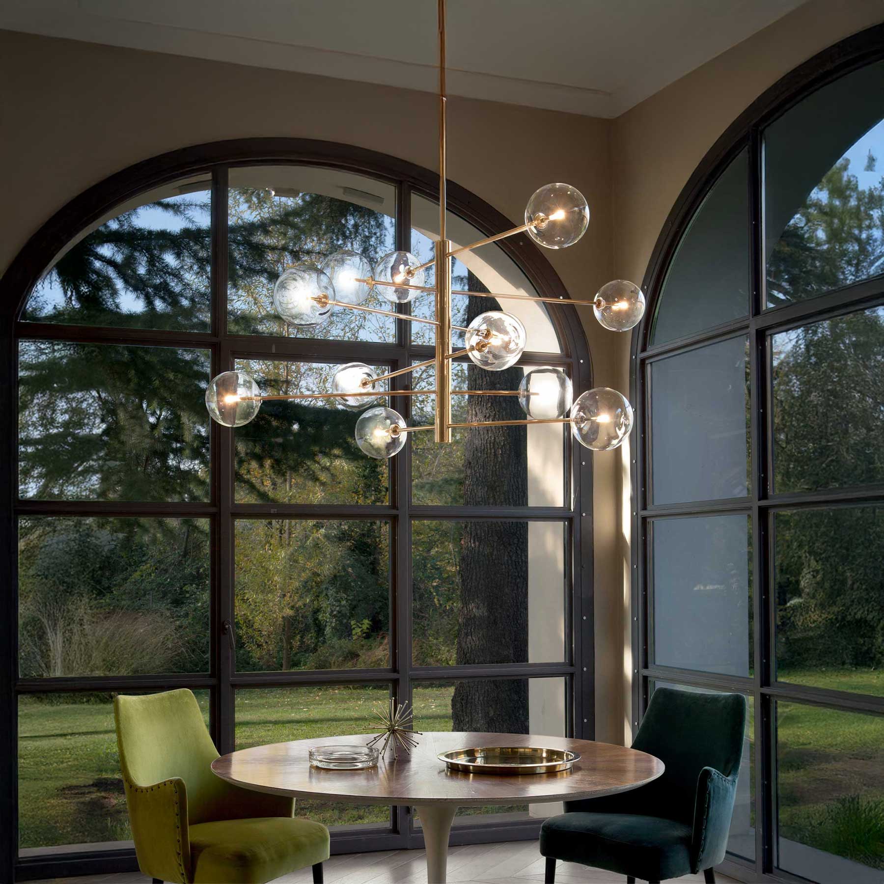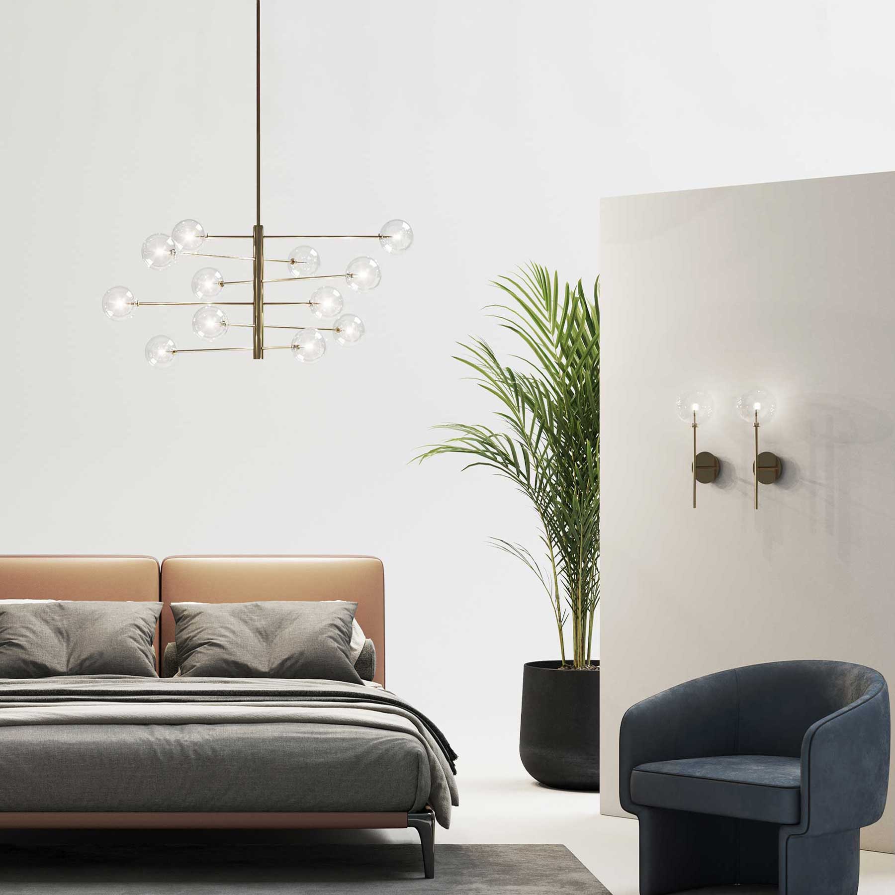 Der Equinoxe Pendelleuchter der italienischen Marke Ideal Lux verbindet luxuriöses Design mit hochwertiger Verarbeitung. Die Metallstruktur ist in poliertem Chrom oder antikem Messing erhältlich und wird durch kugelförmige Diffusoren aus klarem Borosilikatglas ergänzt, die auch in rauchgrau oder bernsteingold getönt werden können. Die Leuchte ist mit acht oder zwölf Schirmen erhältlich und ist mit G4-Fassungen ausgestattet, die eine einfache Auswahl des Leuchtmittels ermöglichen. Das elegante Aussehen der Equinoxe macht sie zu einer geeigneten Ergänzung für moderne und klassische Innenräume.