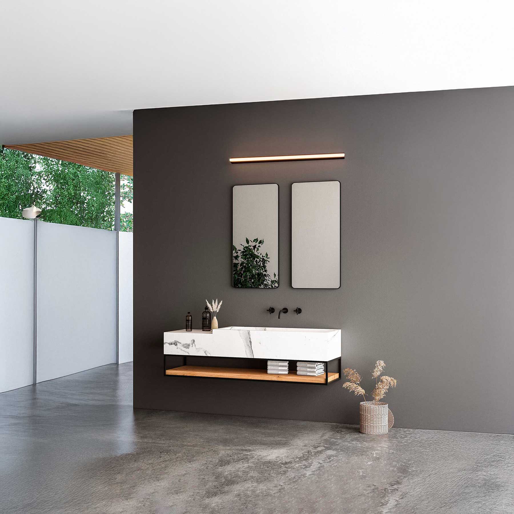 Die Endo Leuchte des renommierten griechischen Herstellers Nova Luce ist eine , die sich ideal für die Beleuchtung über dem Spiegel eignet. Dank der Schutzart IP44 ist sie wasser- und staubbeständig und damit eine großartige Lösung für Nassbereiche wie Badezimmer. Sie verfügt über LED mit einer Farbtemperatur von 3000K, die für ein angenehmes warmweißes Licht sorgt. Die Leuchte ist in zwei Größen erhältlich und bietet so die Flexibilität, je nach Größe des Spiegels oder des zu beleuchtenden Raums zu wählen.