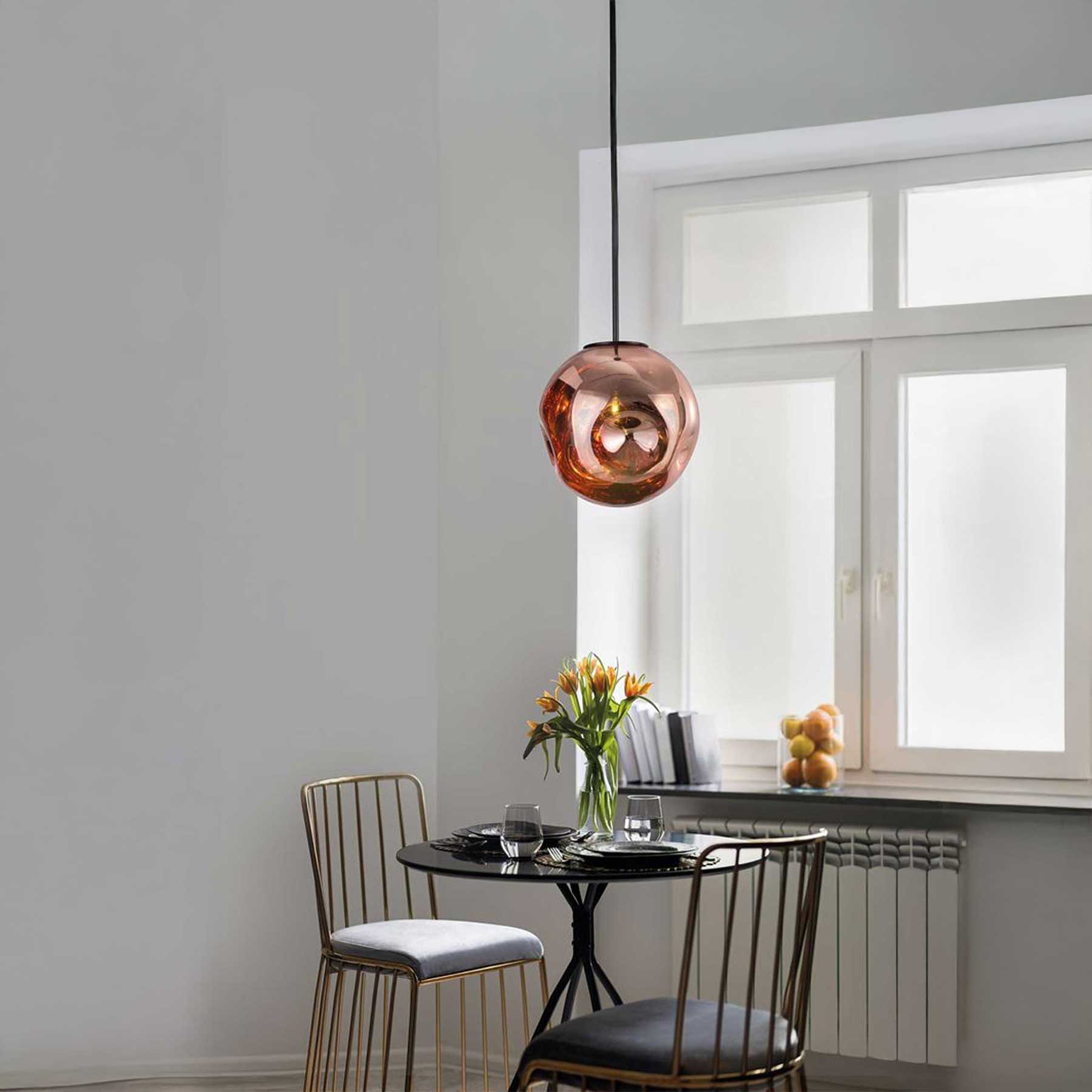 Die Mayan von der renommierten griechischen Marke Nova Luce ist eine elegante Kombination aus modernem Design und feiner Glaskunst. Der Schirm ist aus mundgeblasenem Glas gefertigt, dessen organische Kugelform mit unregelmäßigen Wellen interessante optische Effekte erzeugt. Die Leuchte verwendet einen E27-Sockel, der für Flexibilität bei der Wahl der Lichtquelle sorgt. Mayan ist in drei stilvollen Farbausführungen erhältlich: Kupfer, Champagner und Rauch. Dank ihres unverwechselbaren Aussehens eignet sie sich als einzelnes Element oder als Teil einer Installation mit mehreren Leuchten in modernen Innenräumen.