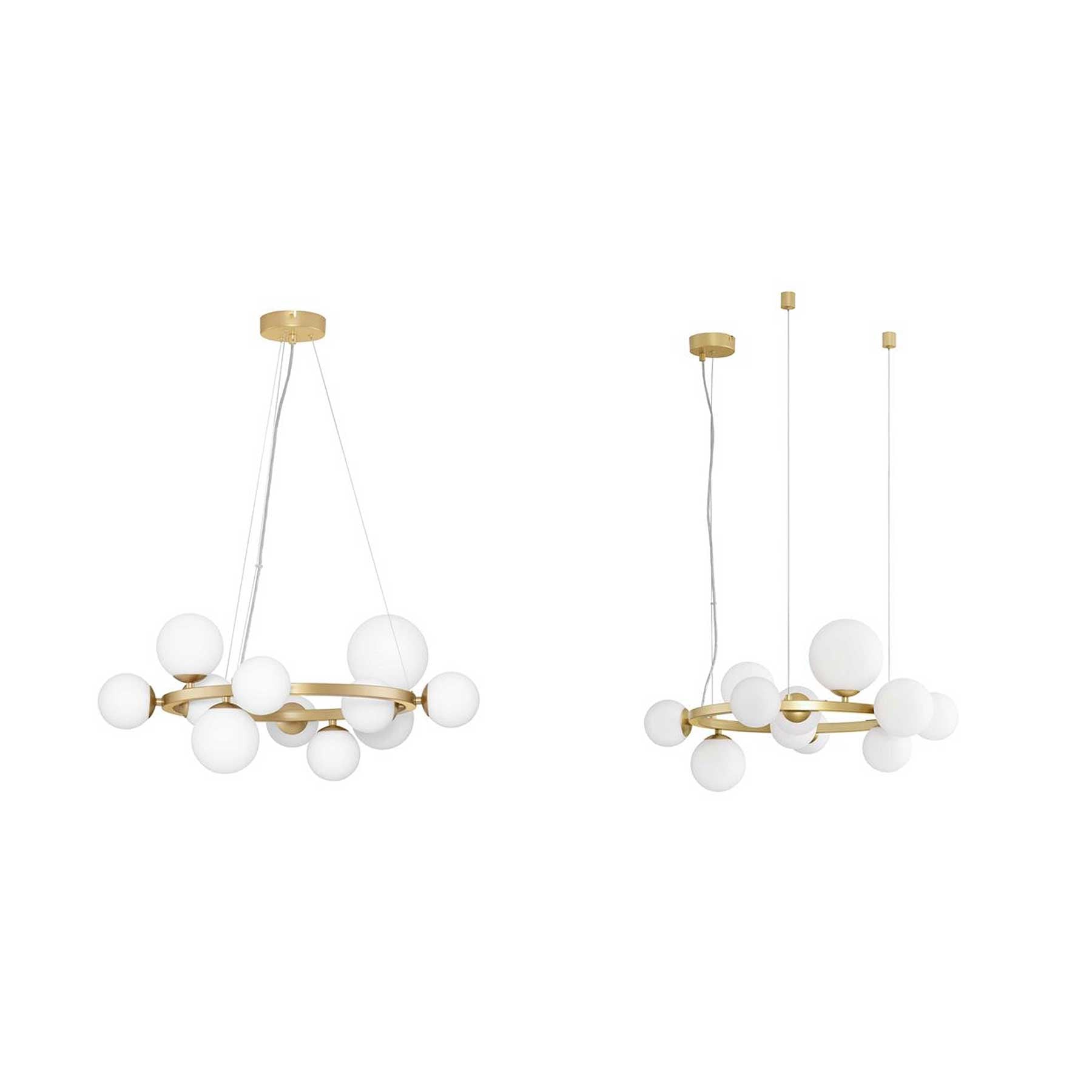 Der hängende Glaskronleuchter aus der OdilliaKollektion von Nova Luce ist ein moderner und eleganter Kronleuchter mit einem runden Rahmen und blasenförmigen Glaskugeln, die dem Interieur einen verspielten und dennoch raffinierten Look verleihen. Die Leuchte verfügt über 11 G9-Fassungen für LED, die auch in größeren Räumen für ausreichend Licht sorgen. Sie ist in drei Glasvarianten erhältlich - klar, rauchfarben und opal. Die Versionen mit klarem und opalem Glas bieten außerdem ein universelles Aufhängesystem an einer einzigen Rosette oder einzeln, so dass Sie die Höhe und den Installationsstil flexibel gestalten können. Dank seines klaren und zeitlosen Designs eignet sich der Odillia Kronleuchter für moderne Wohnzimmer, Esszimmer, Hotellobbys und Büros, wo er nicht nur als Lichtquelle, sondern auch als unverwechselbares Designelement dient.