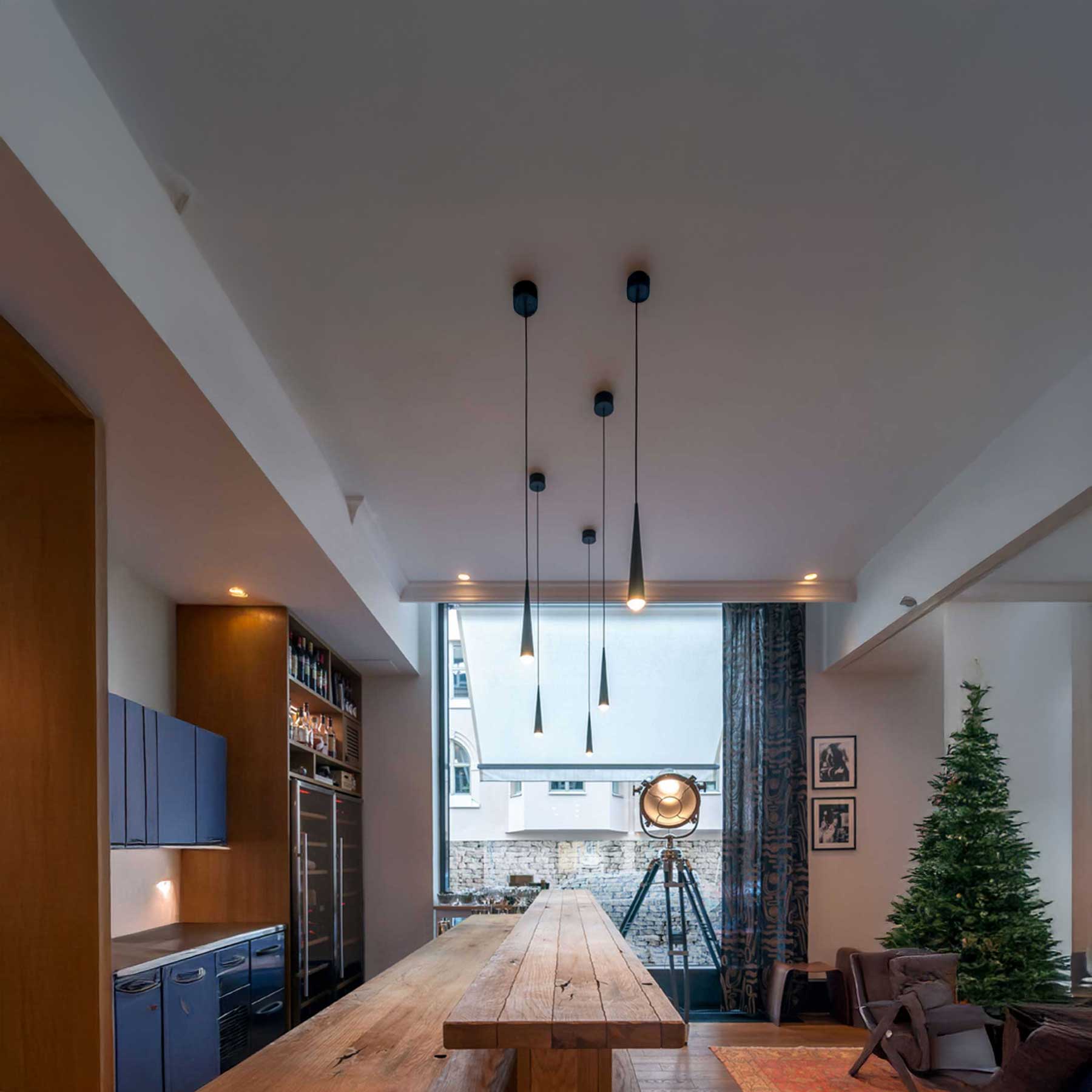 Die Cone des belgischen Unternehmens Wever & Ducré ist eine minimalistische, konische aus hochwertigem Aluminium mit einer matten Oberfläche und Pulverbeschichtung. Sie verfügt über ein verstellbares Aufhängeseil (bis zu 2200 mm) im Farbton Signal Black, warmweißes Licht (2700K) mit hervorragender Farbwiedergabe (CRI ≥ 90) und präziser Farbkonsistenz (MacAdam ≤ 3 SDCM). Die Leuchte ist mit Phasendimmung ausgestattet, arbeitet im Bereich von 220-240 V und entspricht der Schutzklasse I und IP20. Während das Leuchtmittel nicht ausgetauscht werden kann, kann die Steuerelektronik vom Endverbraucher ersetzt werden. Durch ihr elegantes Design und ihre robuste Konstruktion eignet sie sich für moderne Innenräume, Cafés, Restaurants oder Büros, wo sie Funktionalität mit zeitloser Ästhetik verbindet. Die Leuchte wird mit einem Vorschaltgerät geliefert.